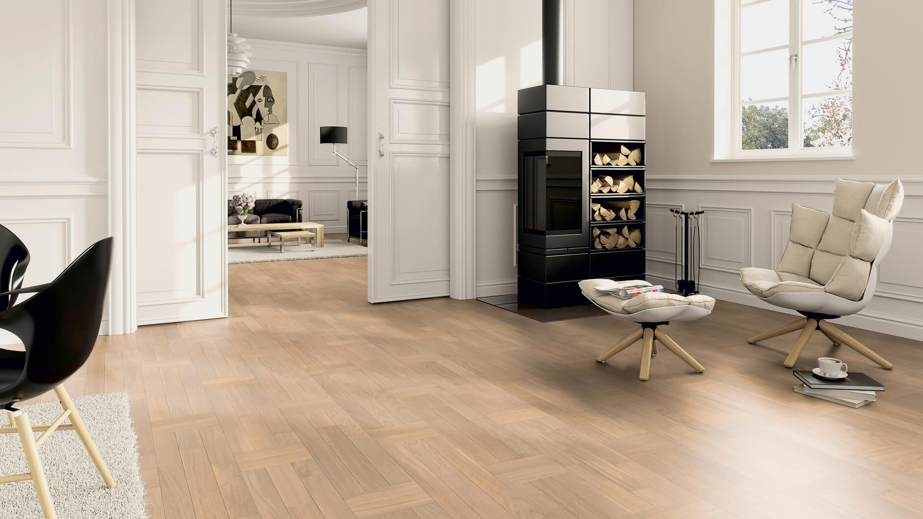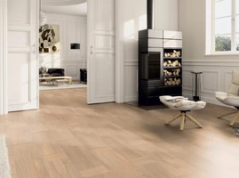 Трехполосная паркетная доска со специальными фасками из коллекции «Contours» создают неповторимый рисунок пола. Фаска подчеркивает каждую ламельку, из которой состоит паркетная доска, и создает неповторимый рисунок. Обработка щеткой и натуральным маслом дополнительно подчеркивают каждую доску. Результат - высококонтрастные акценты и эксклюзивный рисунок.